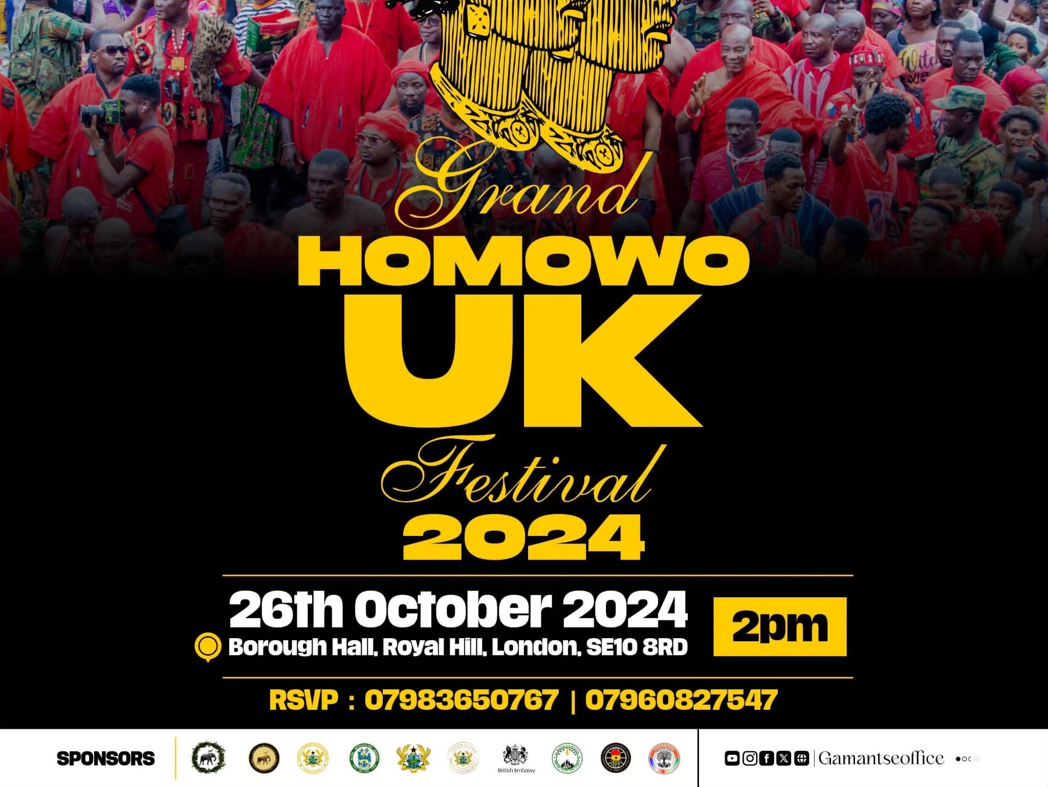 GaDangme UK & Ireland and the Ga Traditional Council are inviting you to join His Royal Majesty King Tackie Teiko Tsuru II, The Ga Mantse, Paramount Chiefs, Queenmothers, and Traditional leaders, to celebrate the Grand Homowo UK Festival 2024 on 26th October 2024.